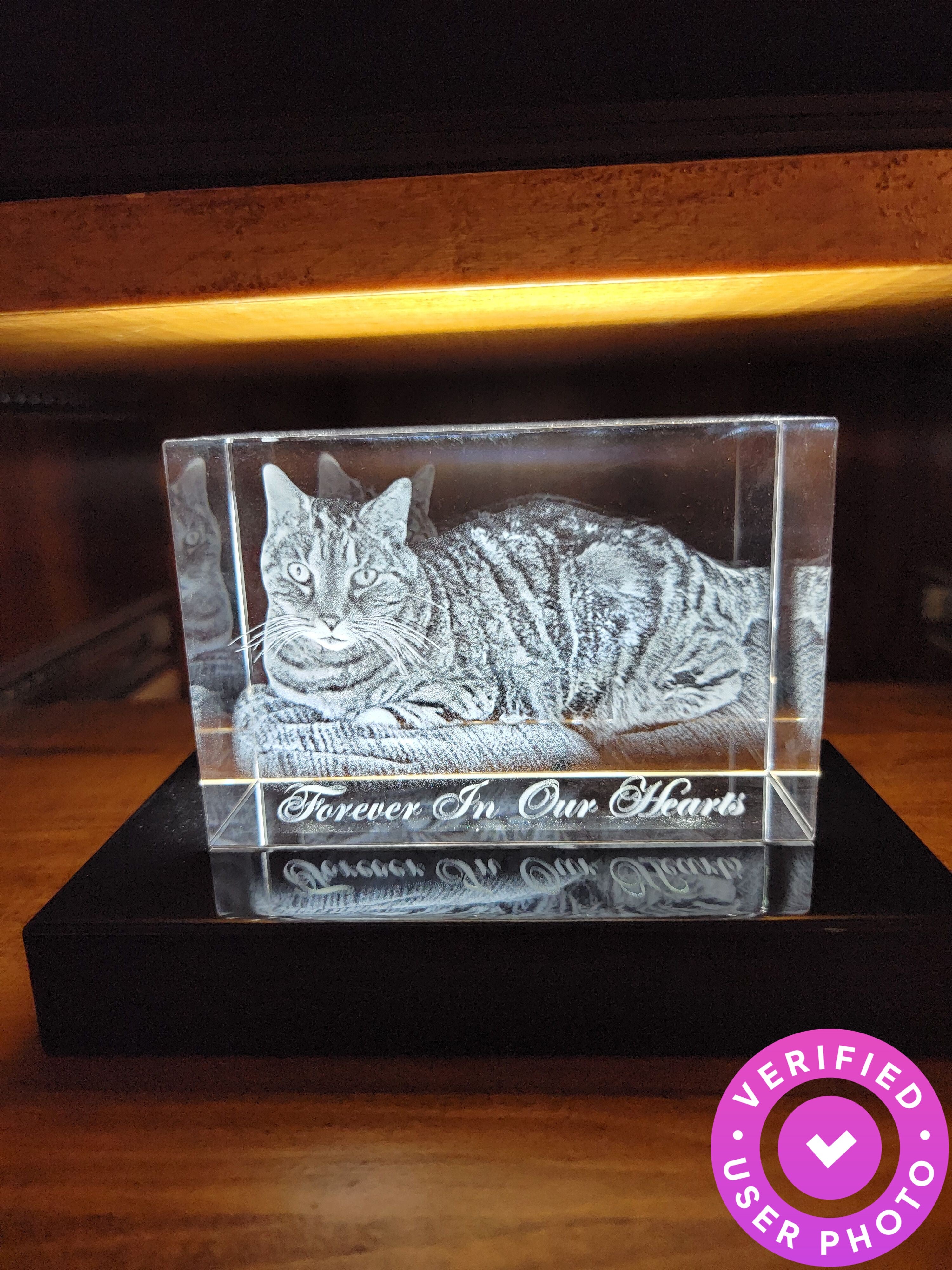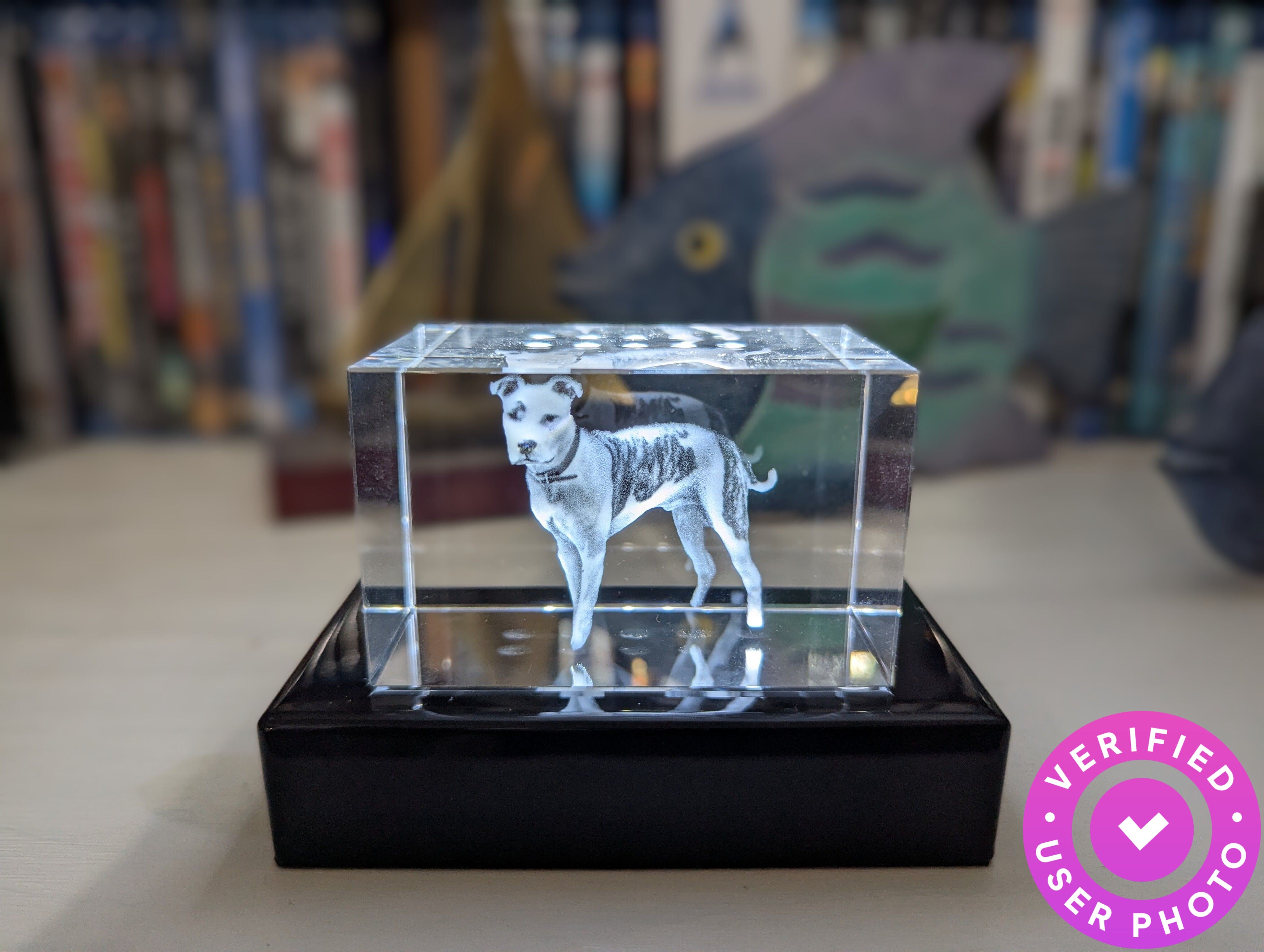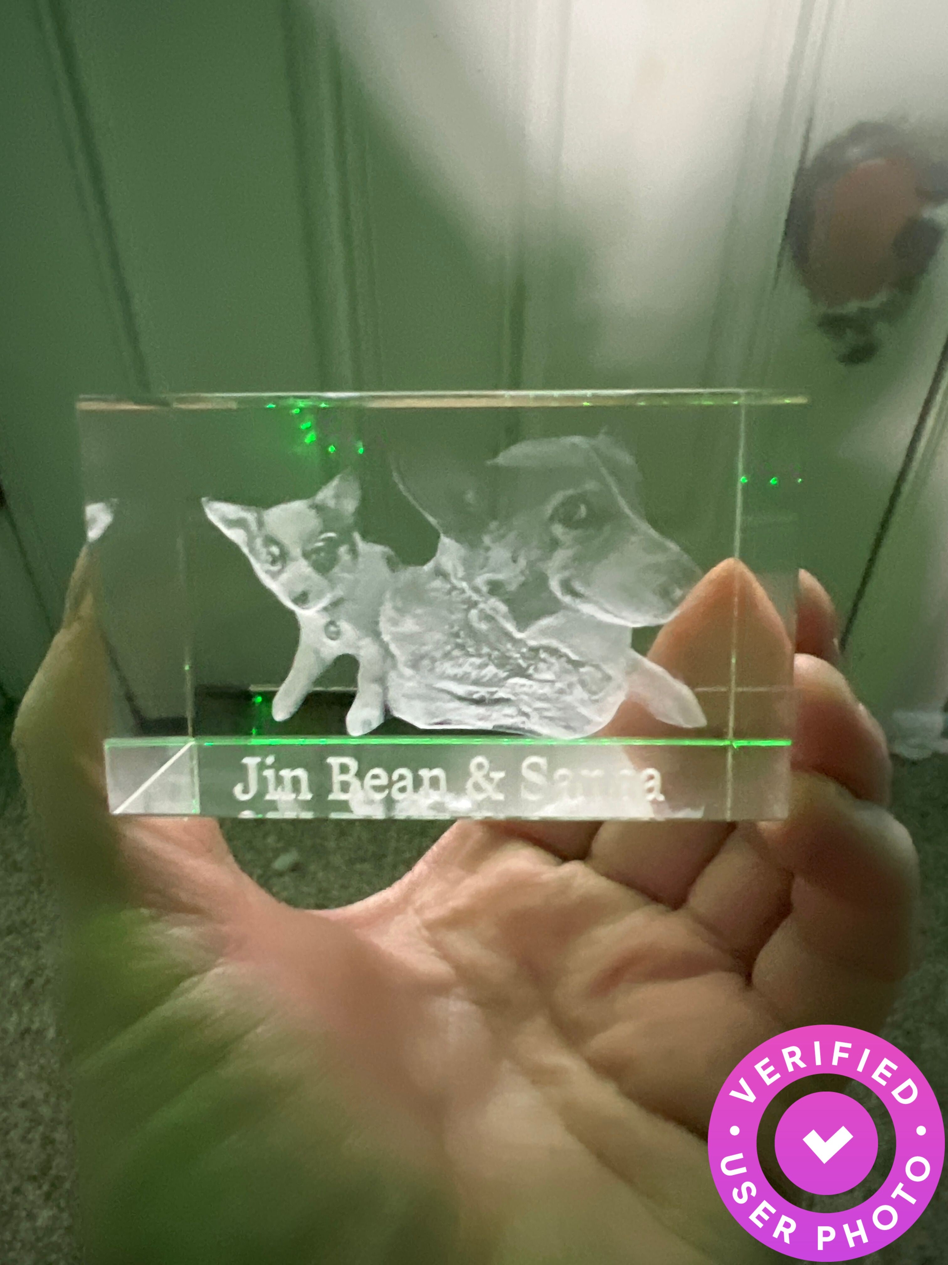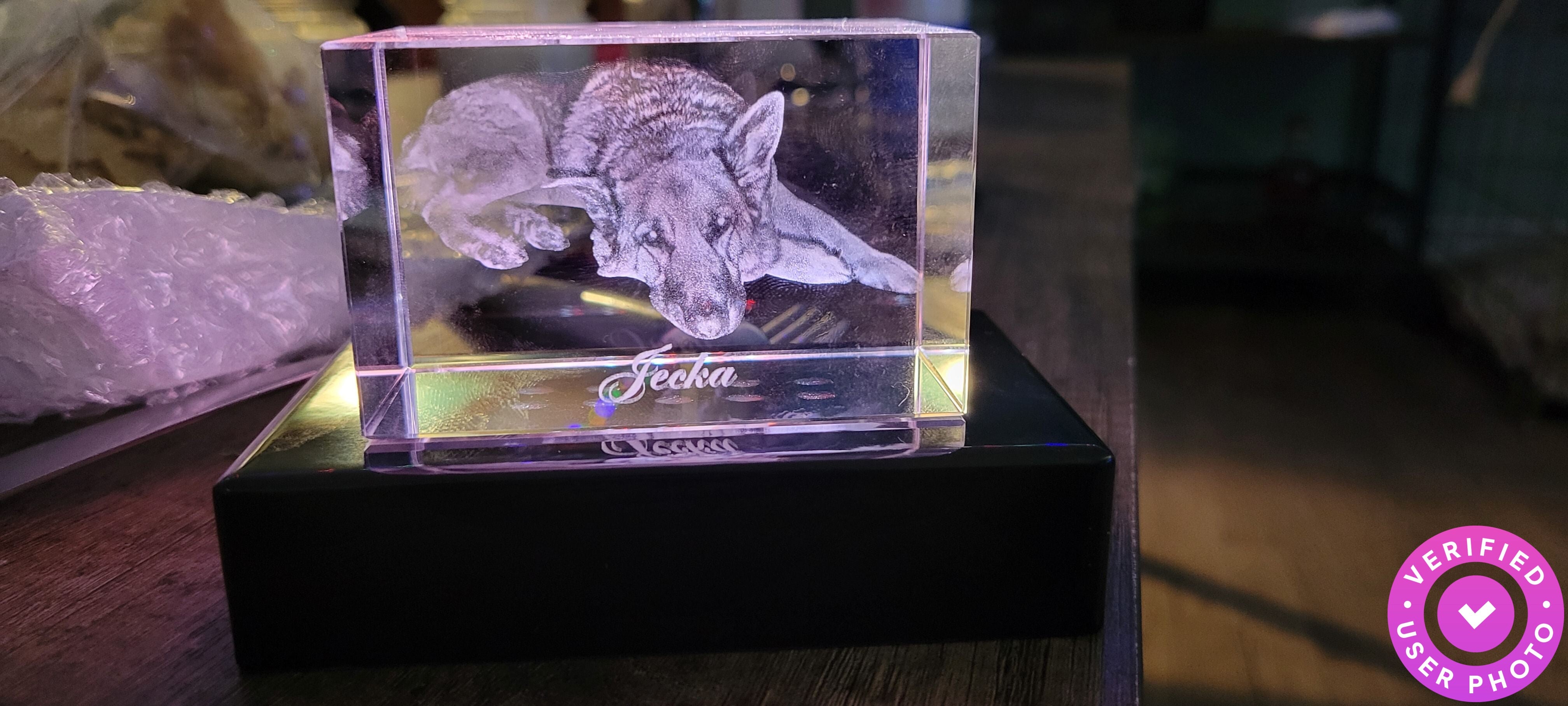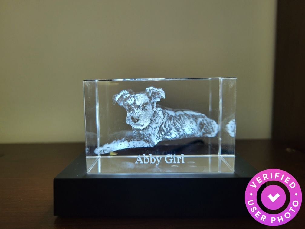 The crystal was a little smaller than expected but I may have needed to make the photo larger since it was taken on my phone. The 3D is awesome! Really cool. If purchasing, I suggest a lighted base as well. I bought 1 with my crystal and I'm really glad I did. The only reason for the 4 stars was size, I expected larger but again it may have needed to be a larger pixel photo. My dog passed away recently and it's perfect for my little memorial.