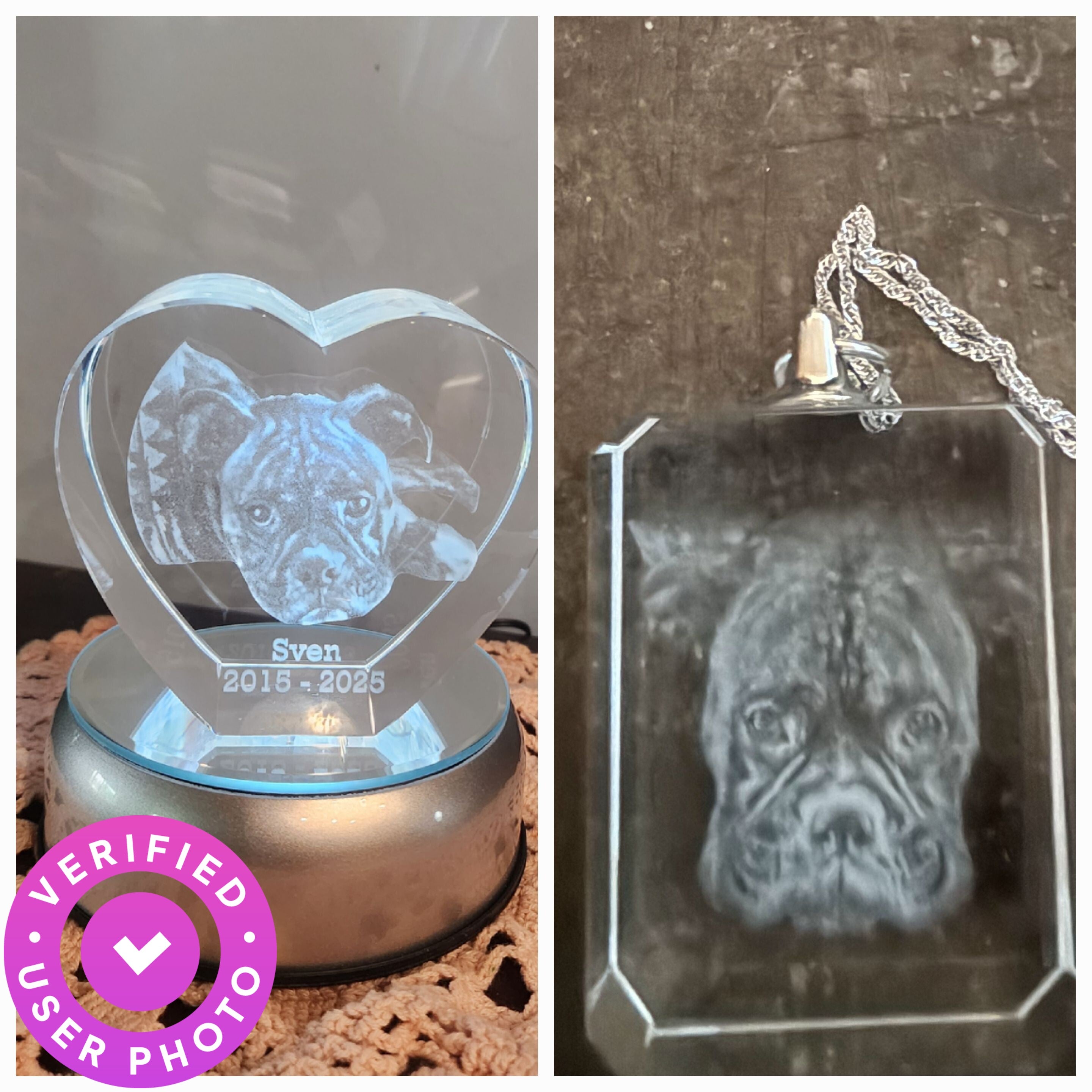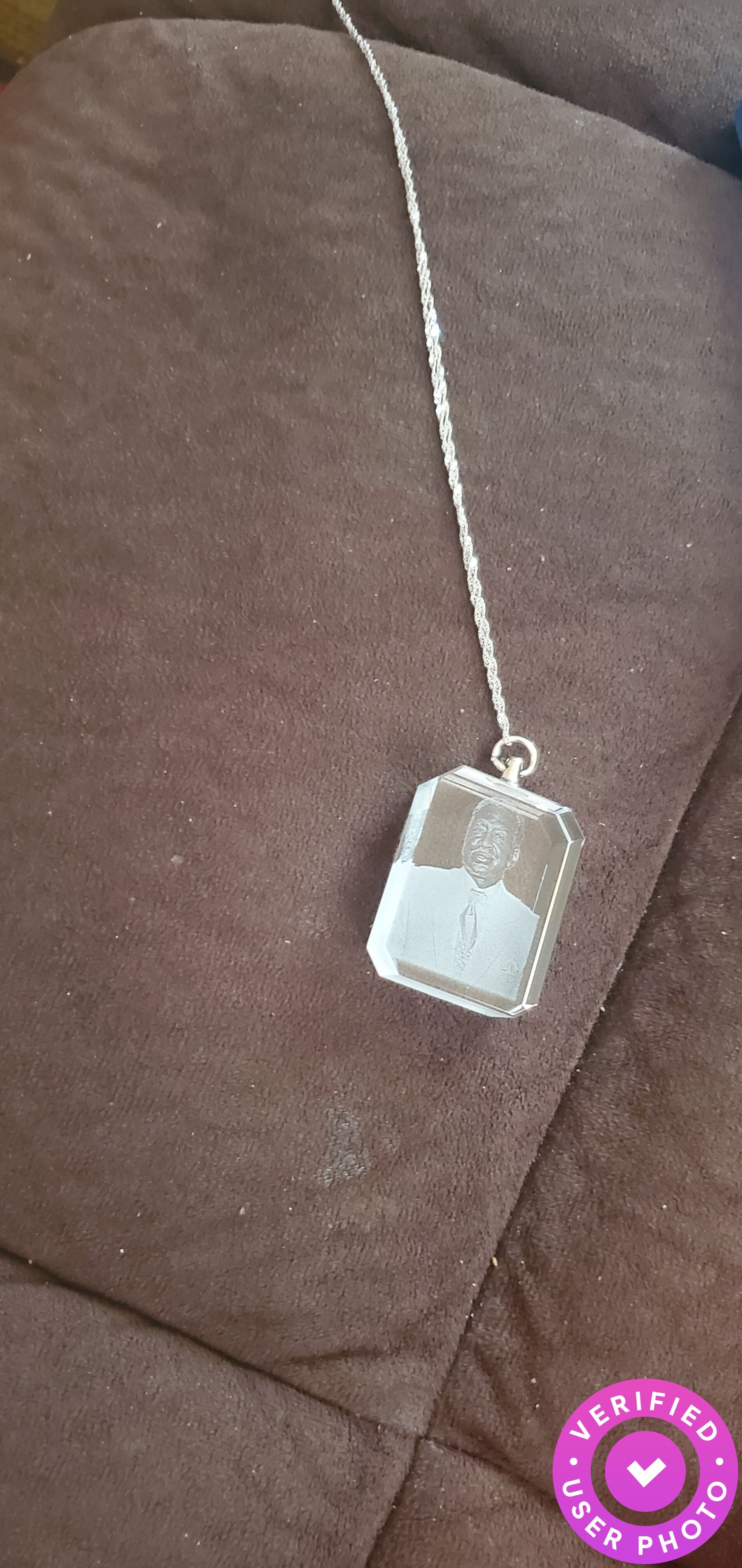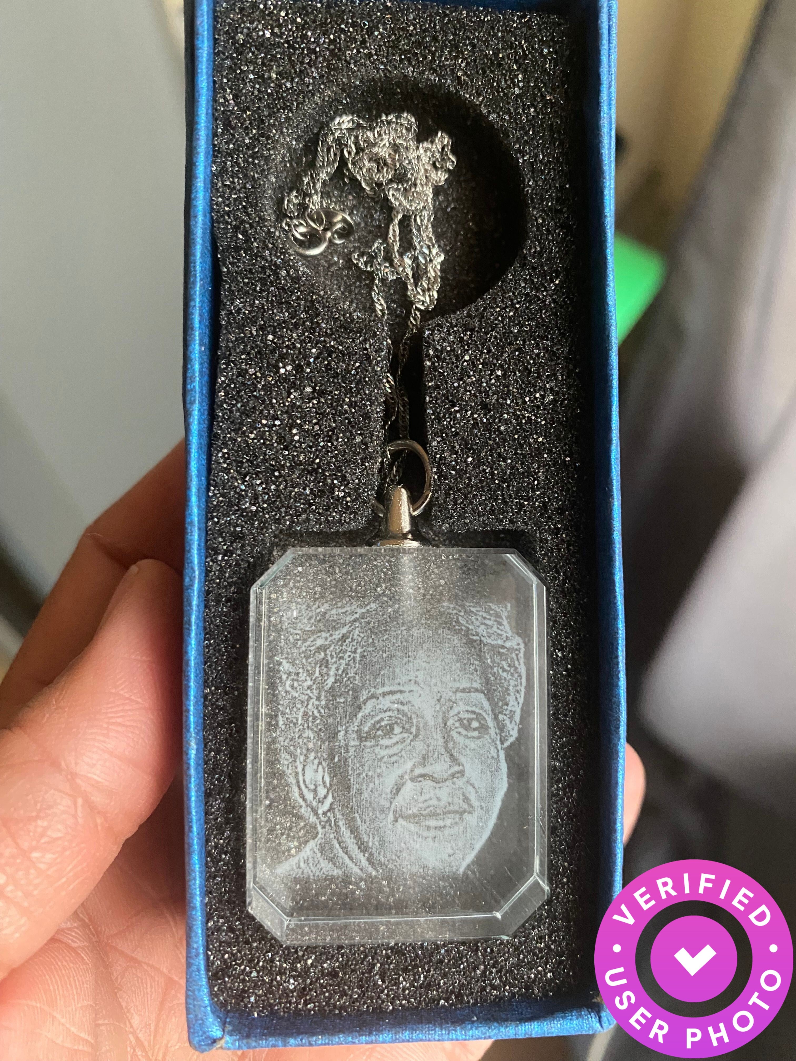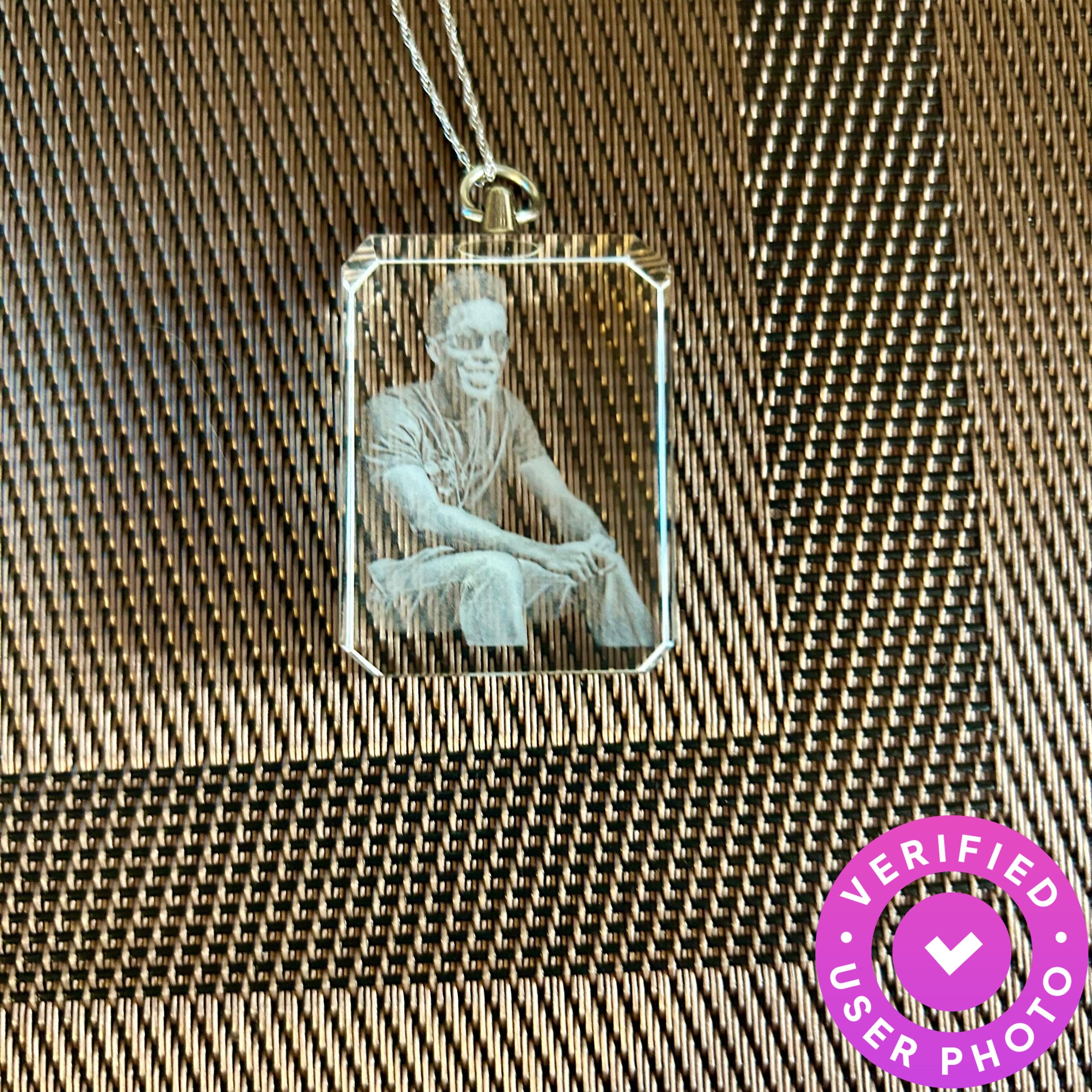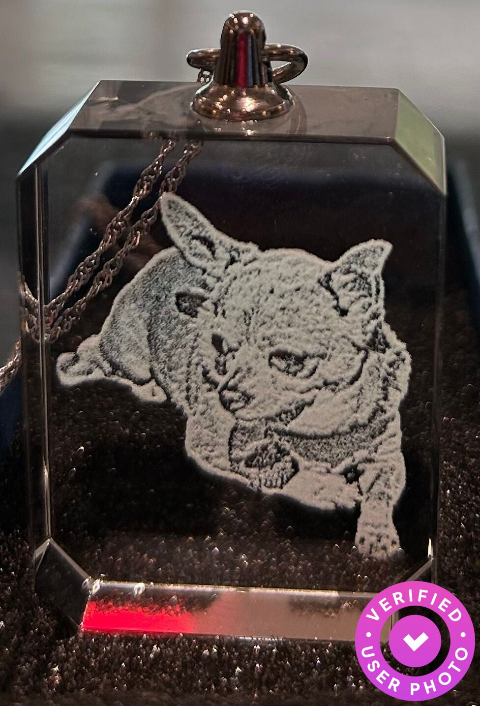 Your image is beautifully engraved in 2D inside of this crystal necklace that is sure to make you, or someone you love, smile with every wear. The crystal is made of beautiful glass and measures 40mm * 30mm * 12mm (1.6" long, 1.2" wide, 0.5" deep), while the necklace is 20" long.